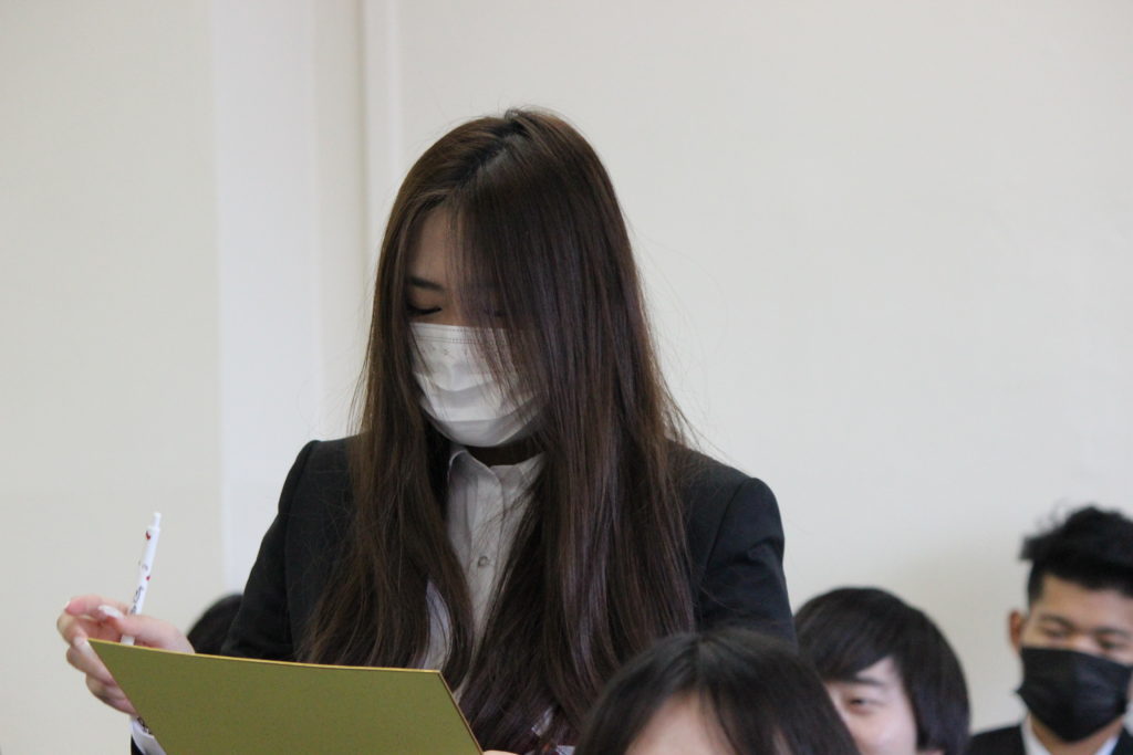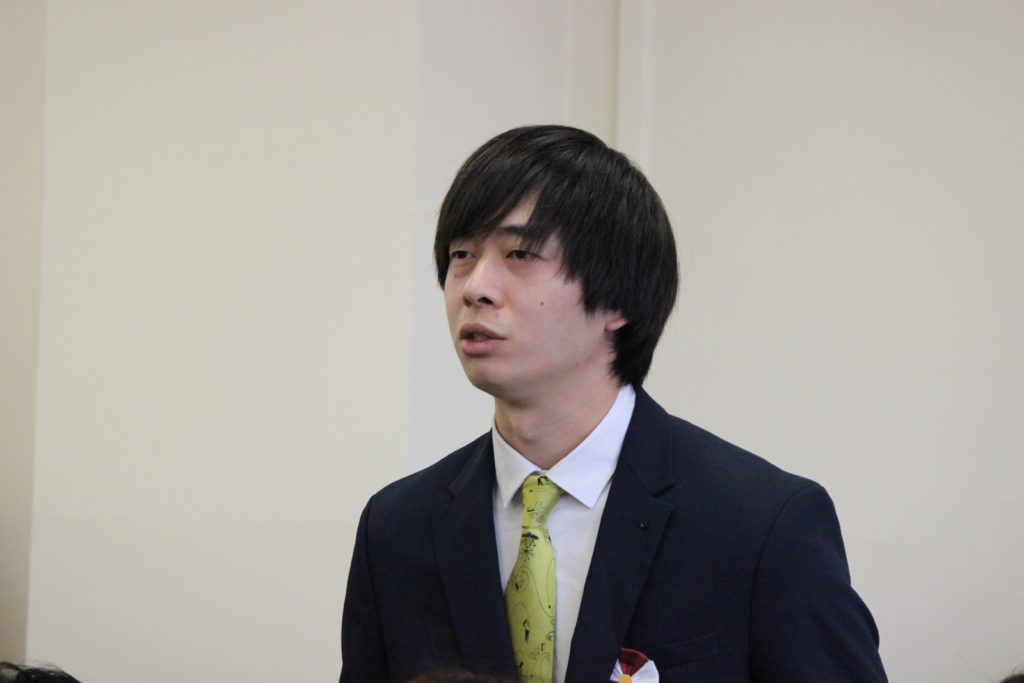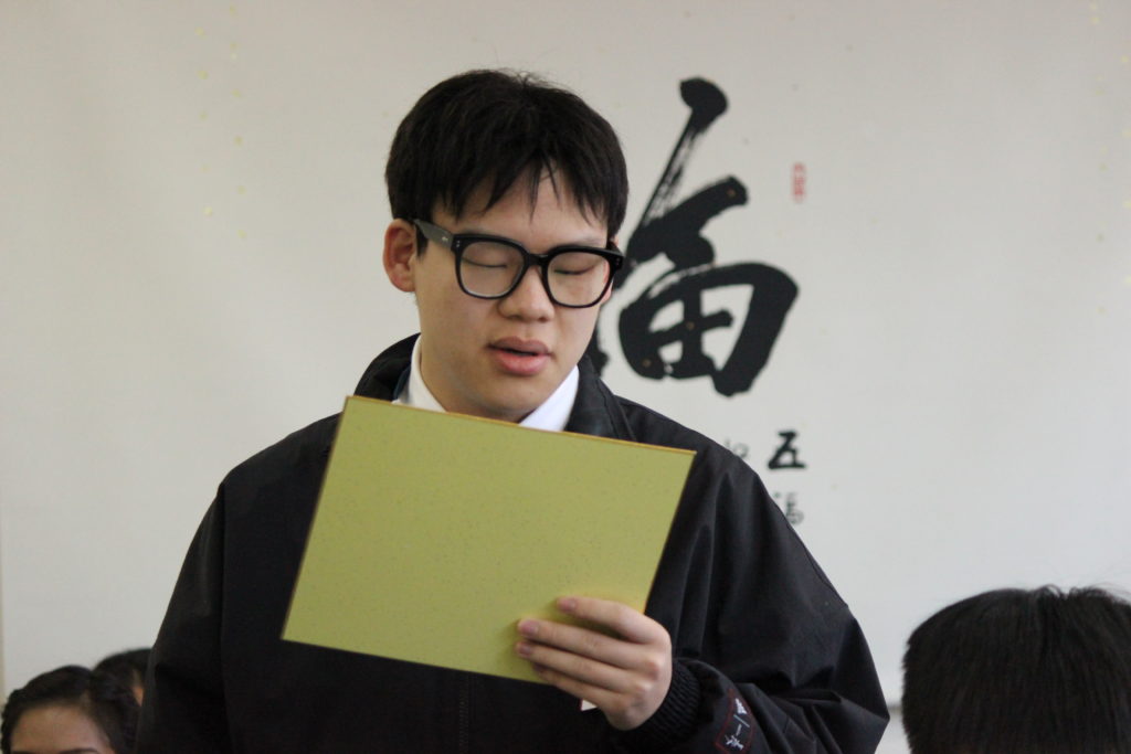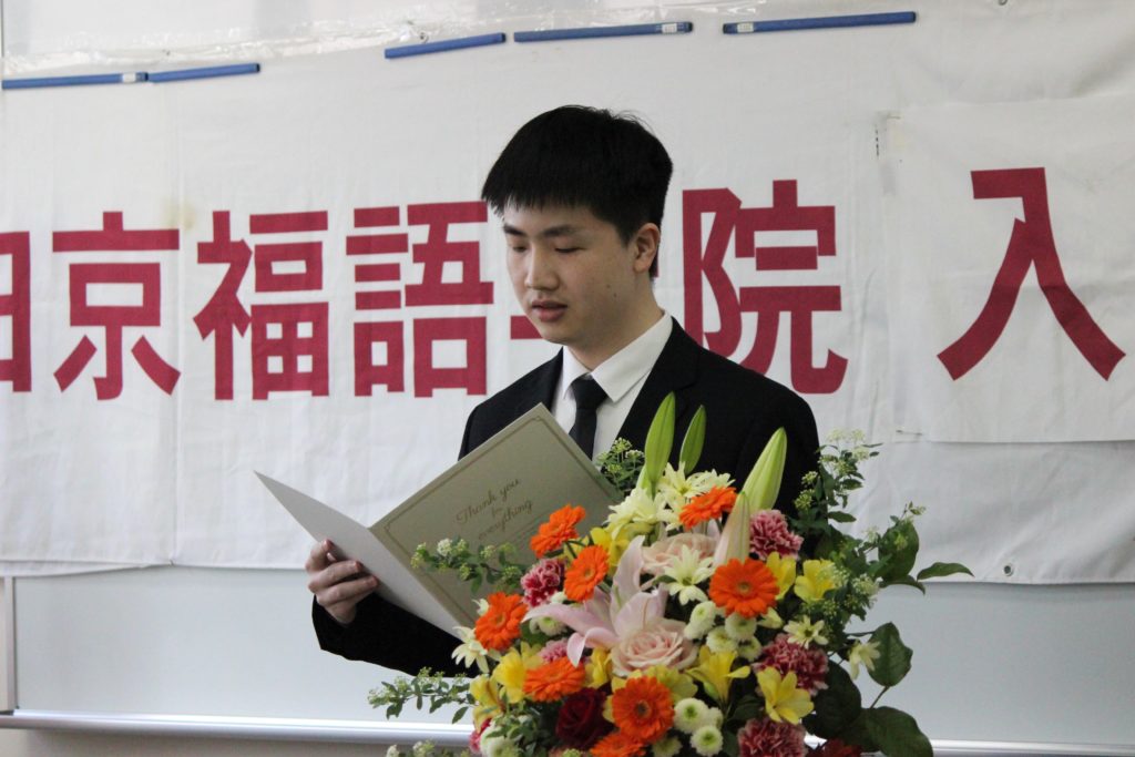 陳致遠さんは新入生代表として、自分の趣味や日本でやりたいこと、卒業後の目標などを色紙に書き、発表してもらいました。